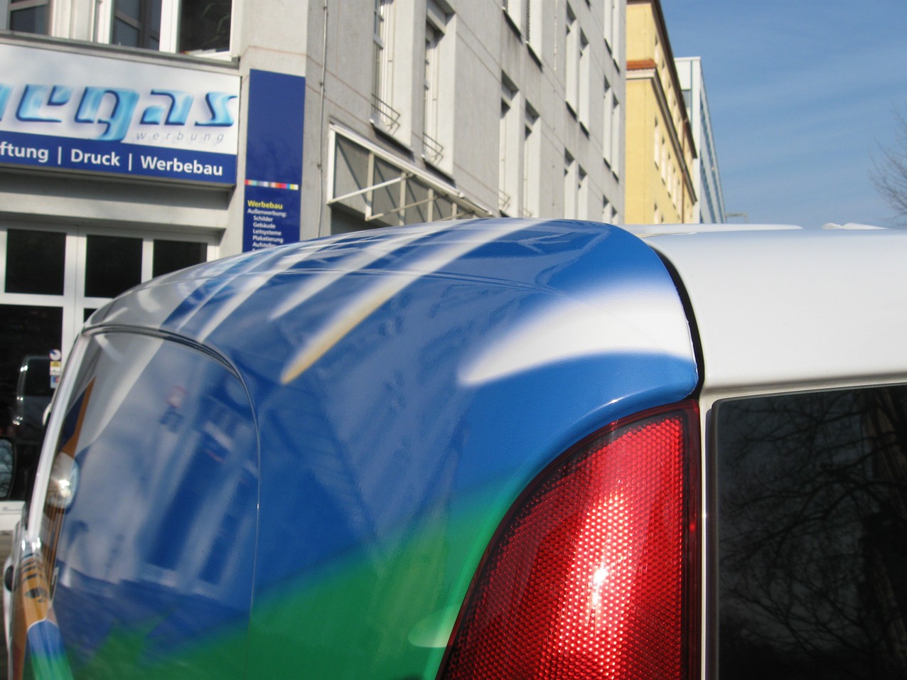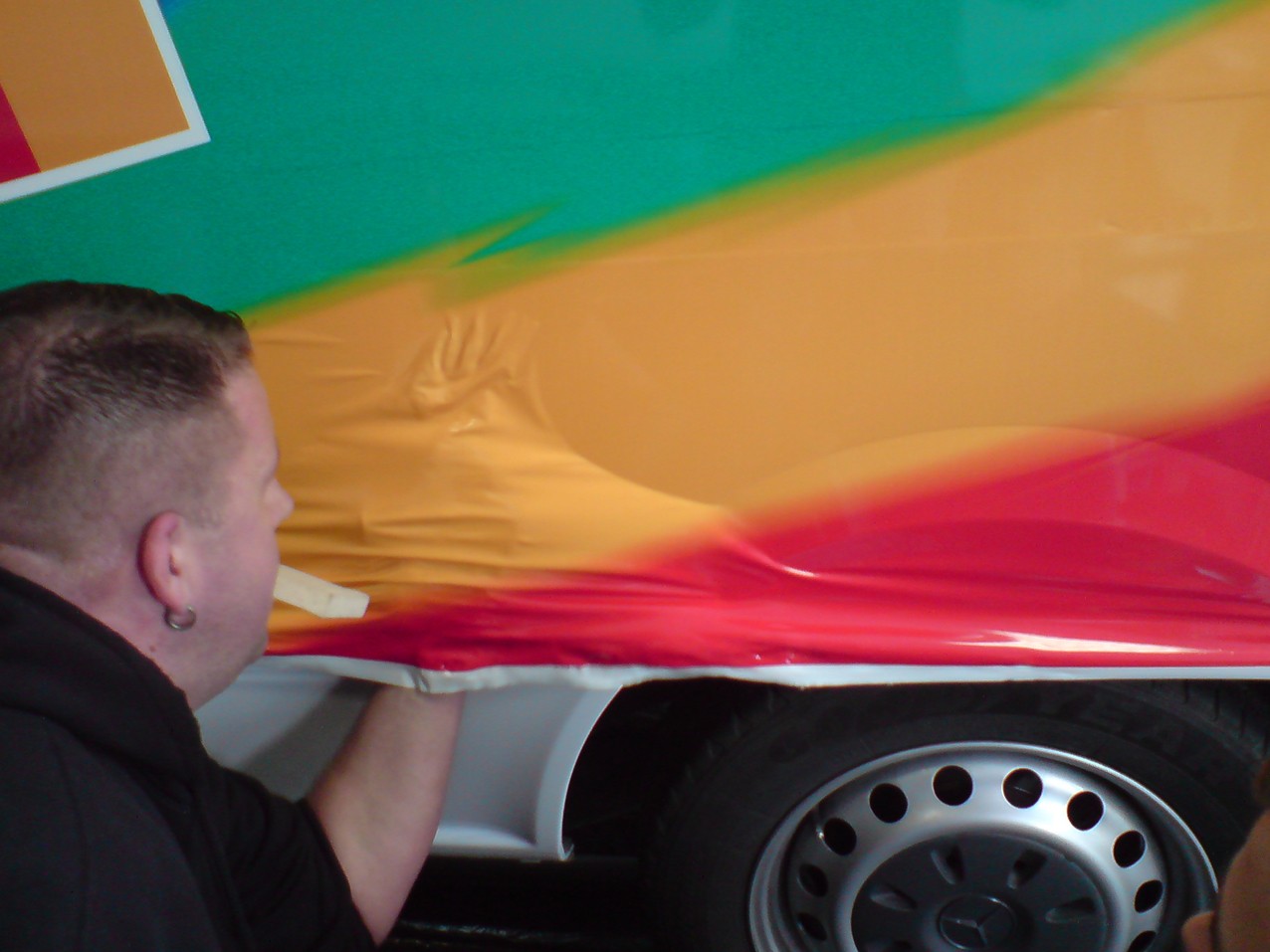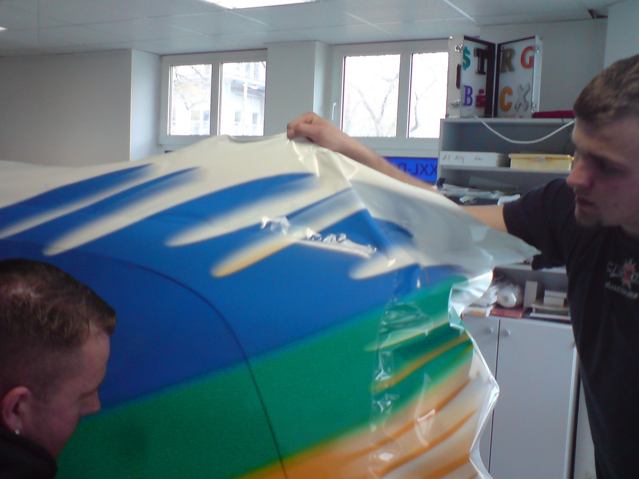 • Aufkleber auf Fahrzeugen mit sehr starke Wölbungen, Sicken, nahezu blasenfreie Verarbeitung durch Mikrokanäle