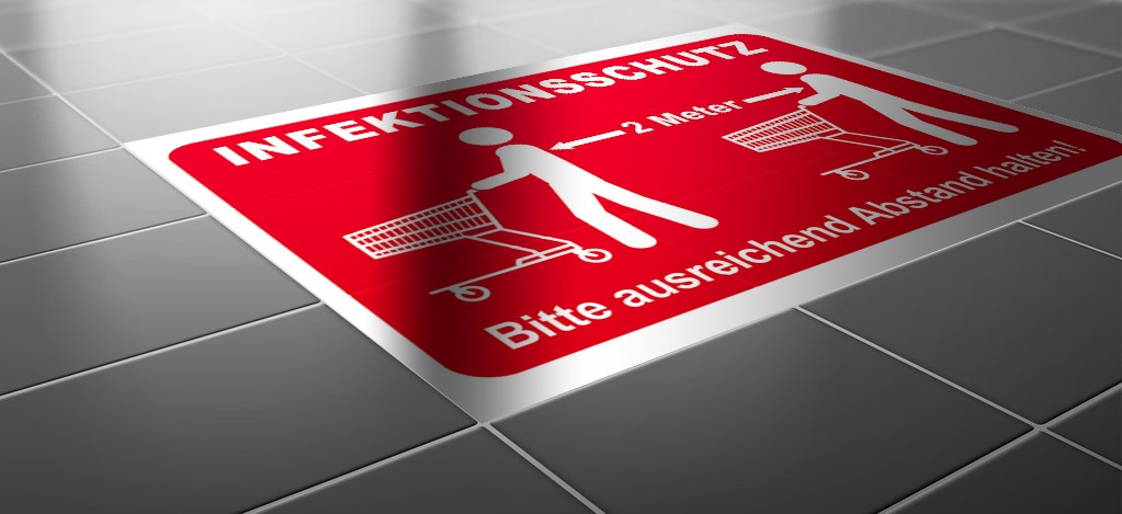 Aus aktuellen Anlaß (Corona Virus Krise) & hohen Bedarf können wir Ihnen im Sofortdruck Aufkleber für die Fliesen und Laminatboden Bodenwerbung drucken und liefern