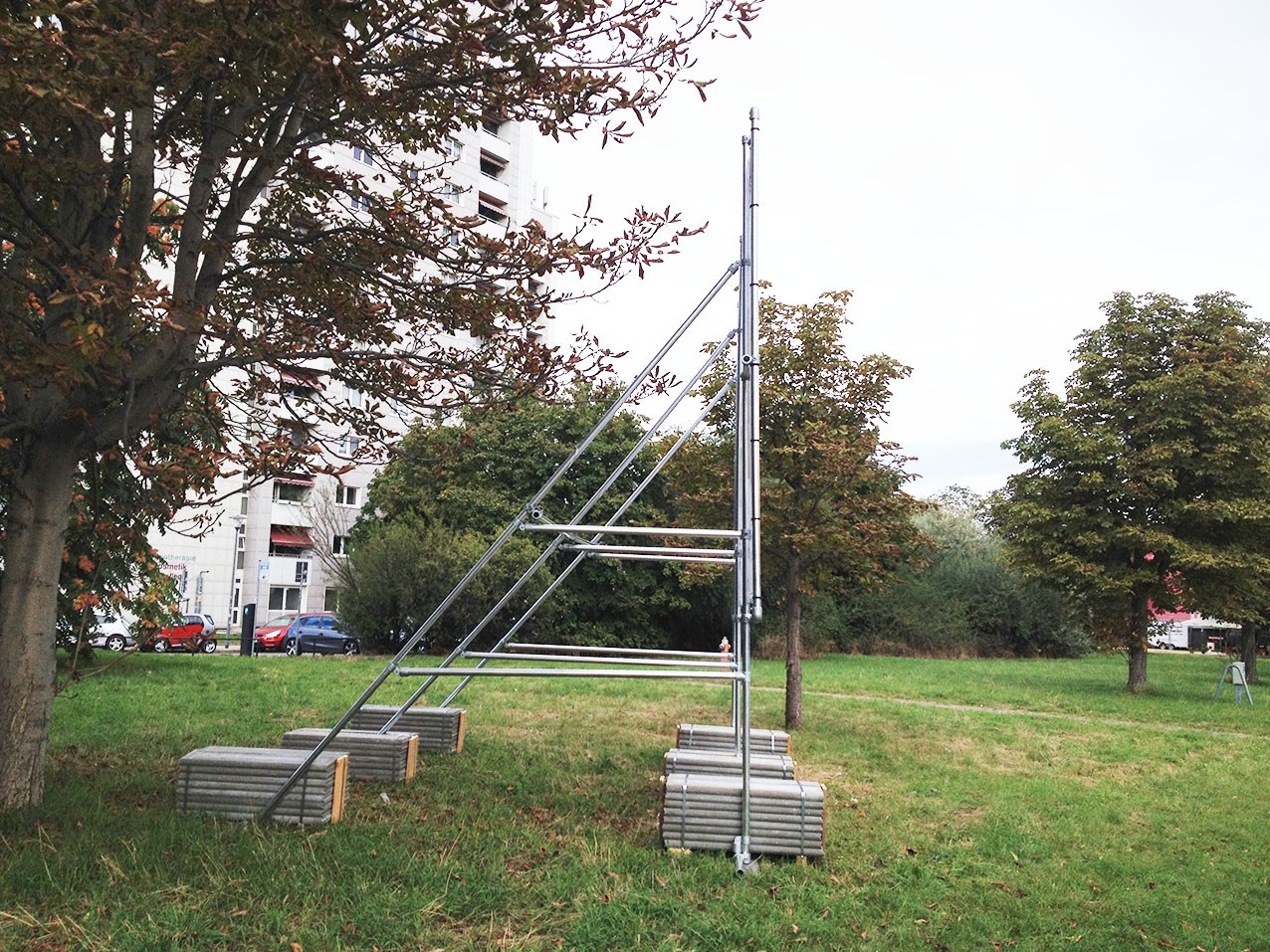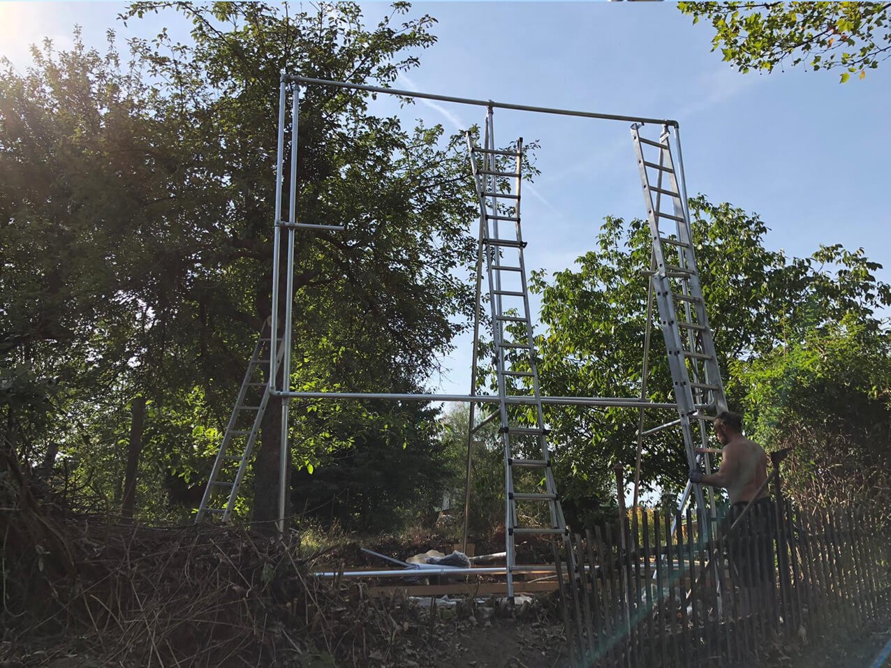 - Alurohrgestell, aus Aluminiumrohr 48 x 3 mm, inkl. 1,50 m über Bodenoberfläche, freistehender Rahmen für Plane, Bsp. 3 x 2 m Plane + 1,50 m Gestell = 3,50 m Gesamthöhe; Tiefe berechnet sich aus Gesamthöhe : 2 = 1,75 m