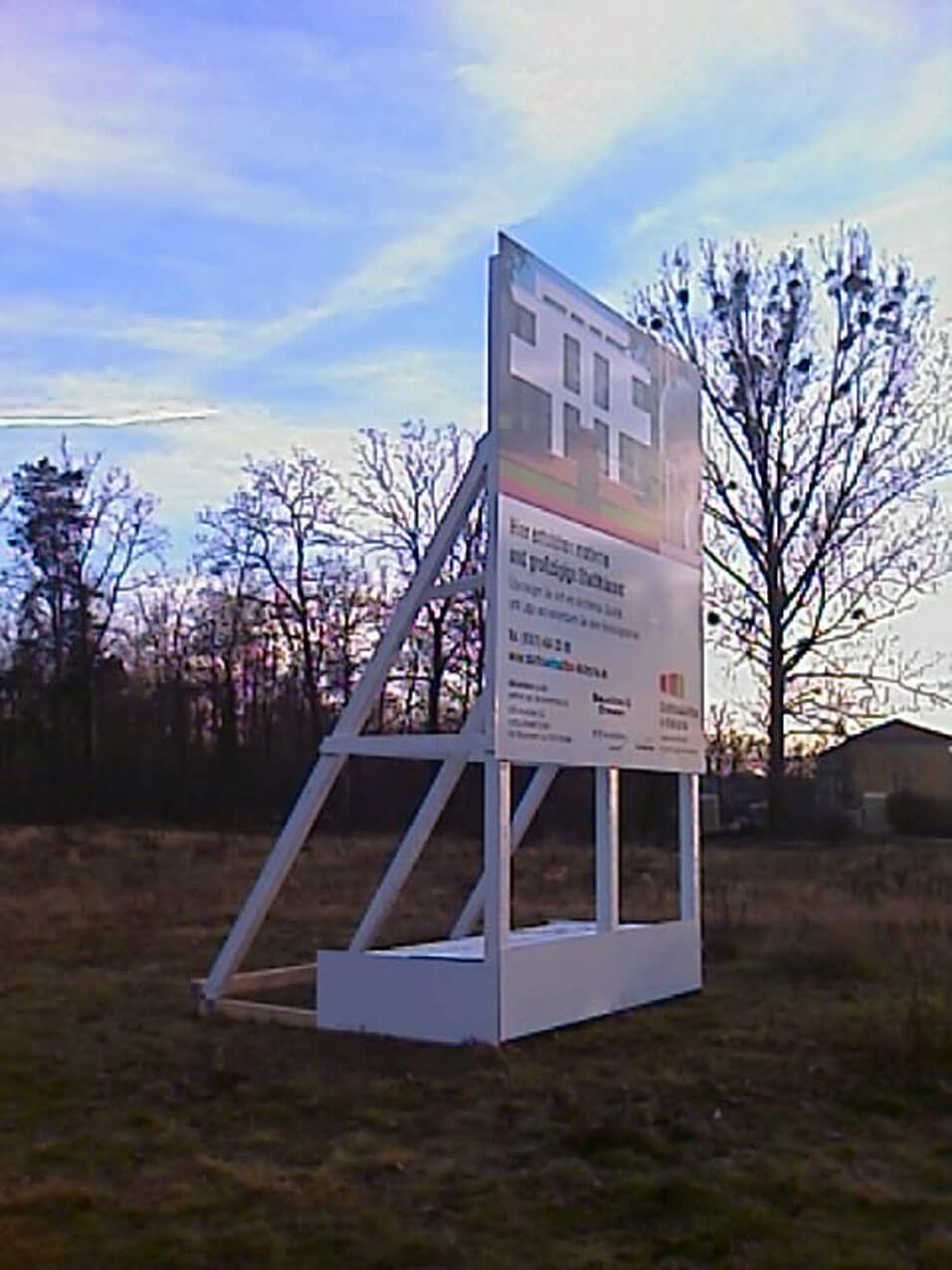 - Sie können von uns auch eine komplette Herstellung von Bauschilder, Bautafeln, Eckbauschild, über Eck Aufsteller (Dreieck) Bauschildanlagen, Werbegerüst, Gestelle in Holz, Aluminium, feuerverzinkten Stahl erhalten