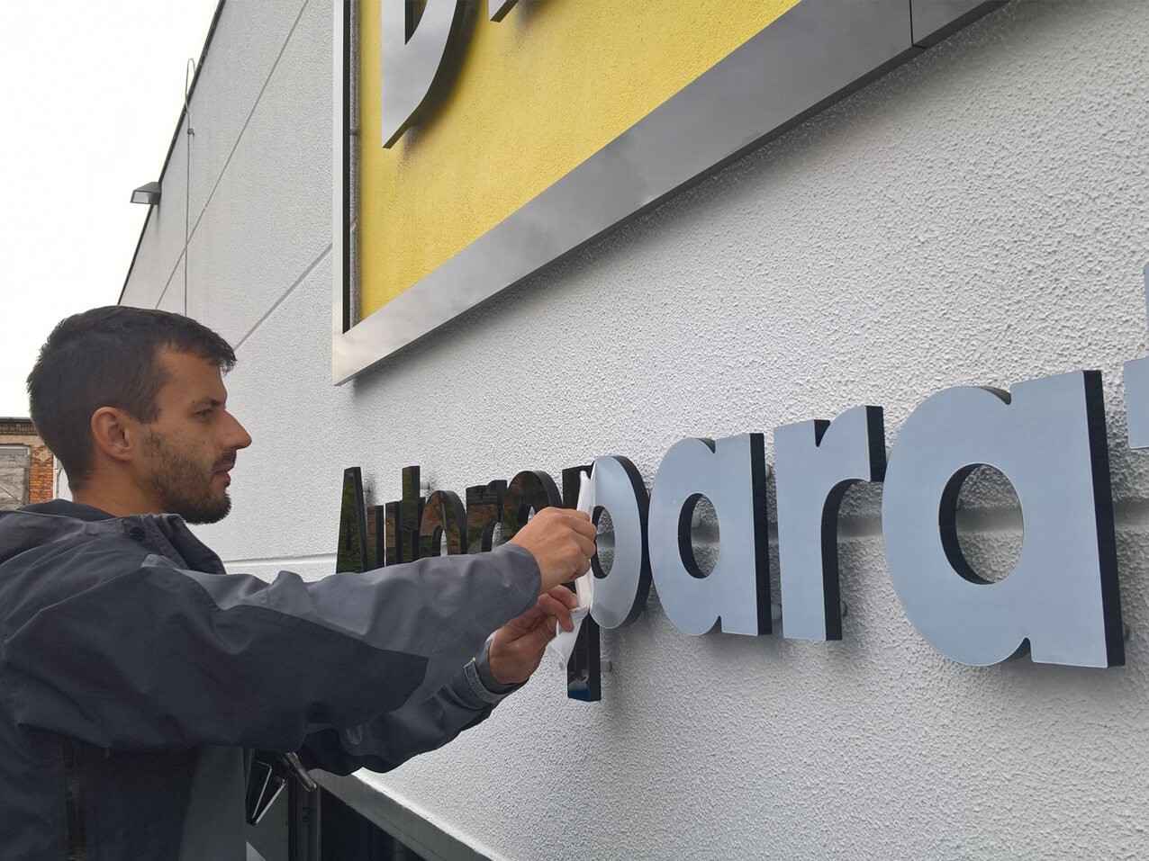 • Fräsbuchstaben alle RAL Farben, Schrifttyp Arial oder ähnlich, Versalhöhe = Großbuchstabenhöhe oder Kleinbuchstabe, inkl. Montageschablone für Schriftzug