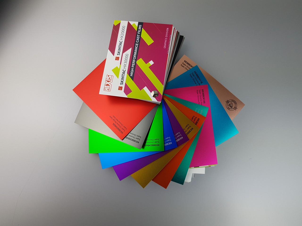 Farbfächer Designfolien, Autofolien, Carwrapping von Hexis mit Metallic, Glanz, Matt, Carbon, Leder, Strukturen Alligator, Fisch, Chrom, Flip Flop, Glitzer; Made in Frankreich
