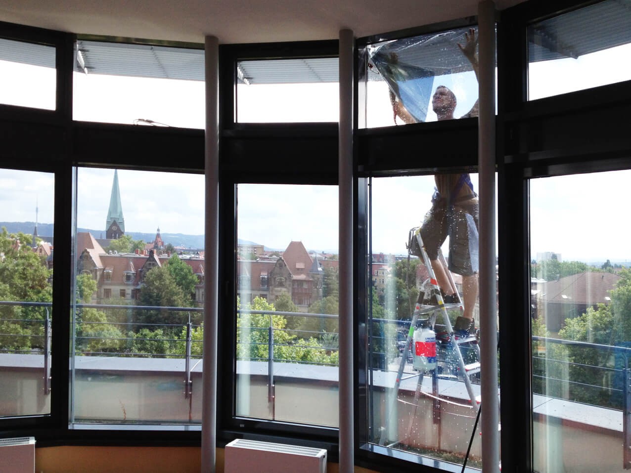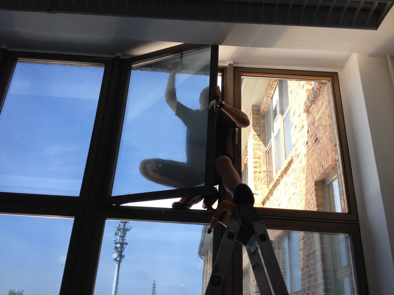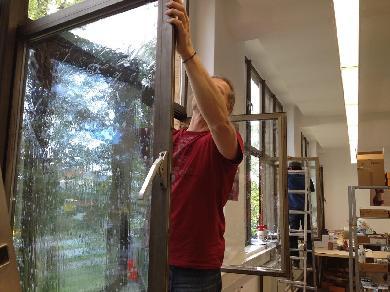 • mit dem Fensterwischer werden die Scheiben direkt vor dem verkleben grob gewaschen