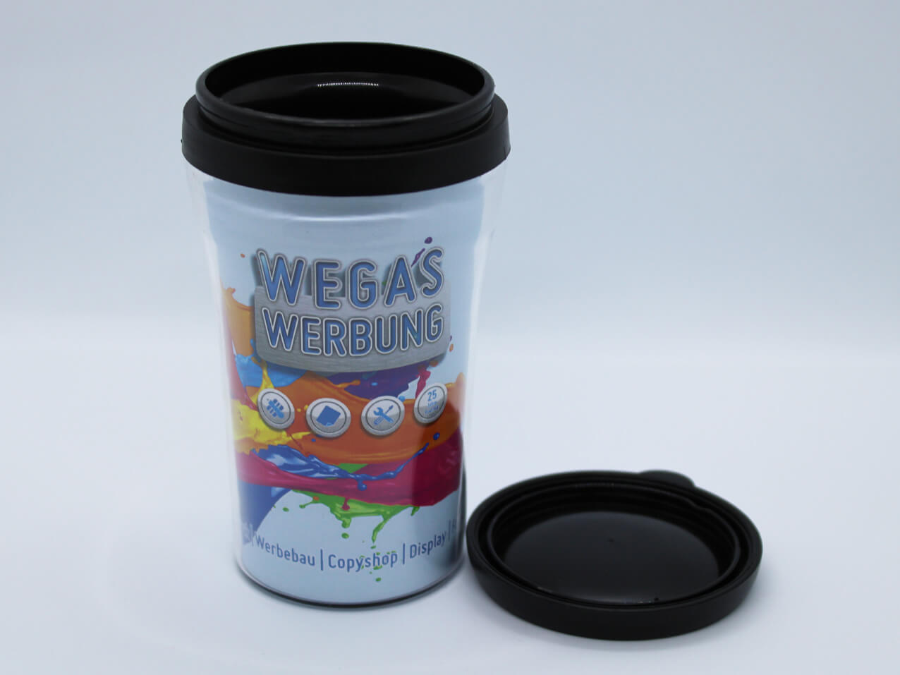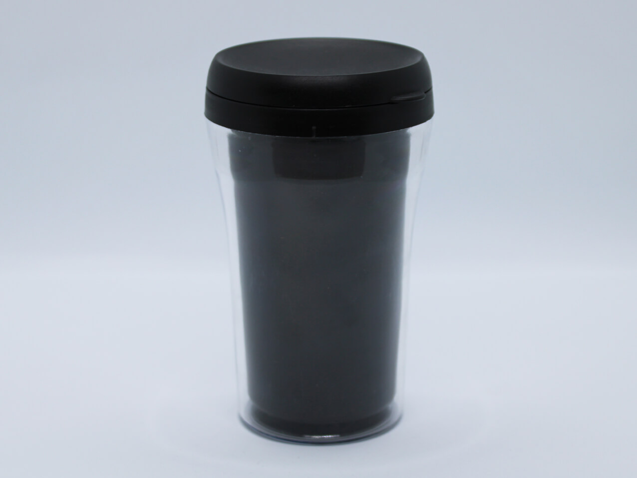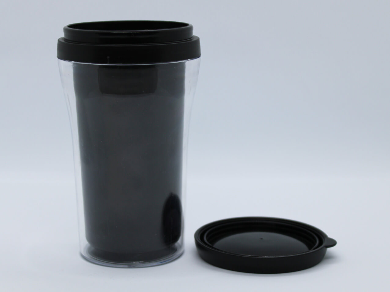 - doppelwandiger Kunststoff Becher aus transparentem Außengehäuse mit komplett abnehmbaren schwarzen Deckel