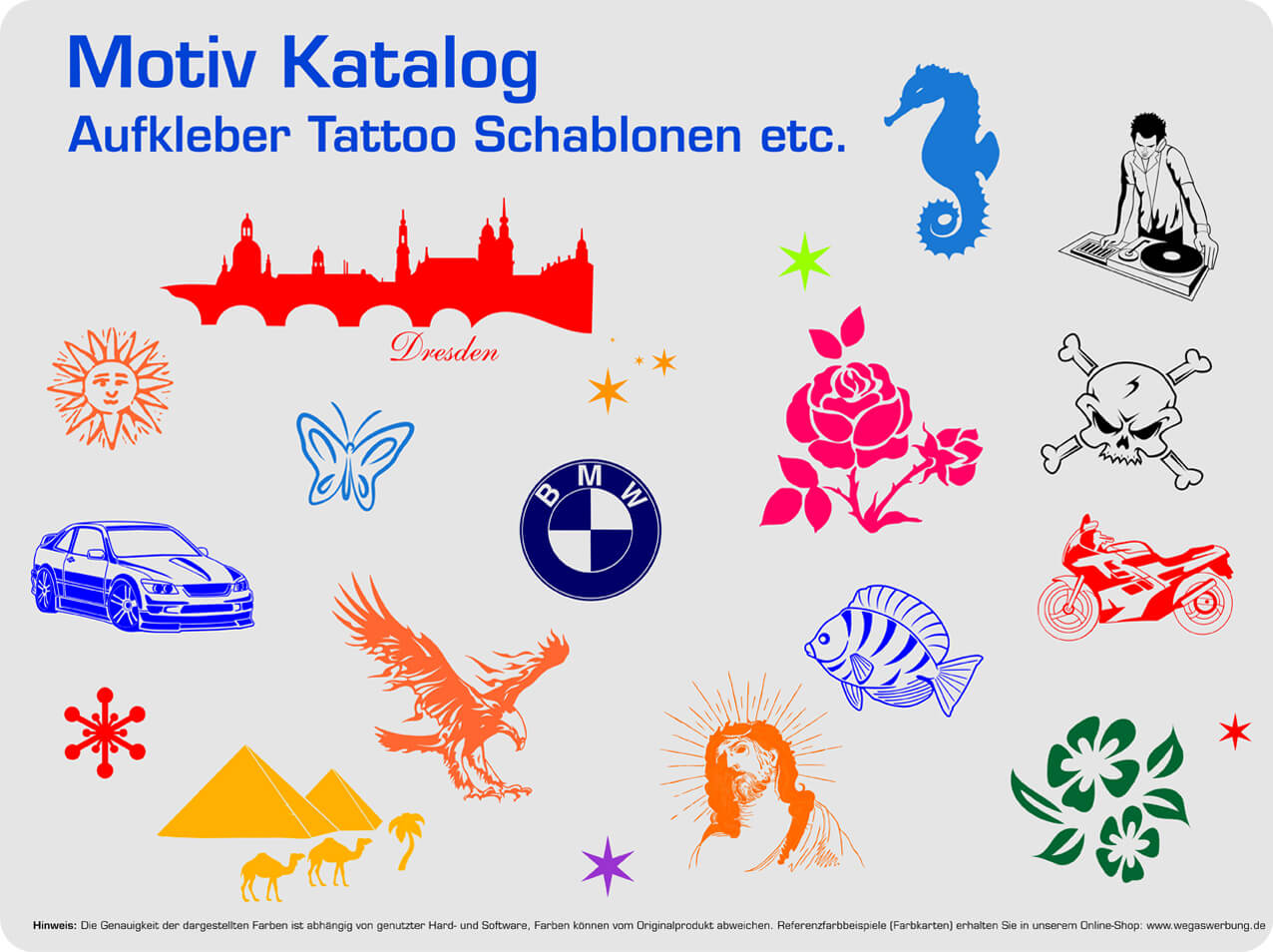 - Sollten Sie kein Motiv, Grafik, Foto, Bild finden, so schicken Sie uns Ihre Vorstellung per eMail an : shop@wegaswerbung.de
