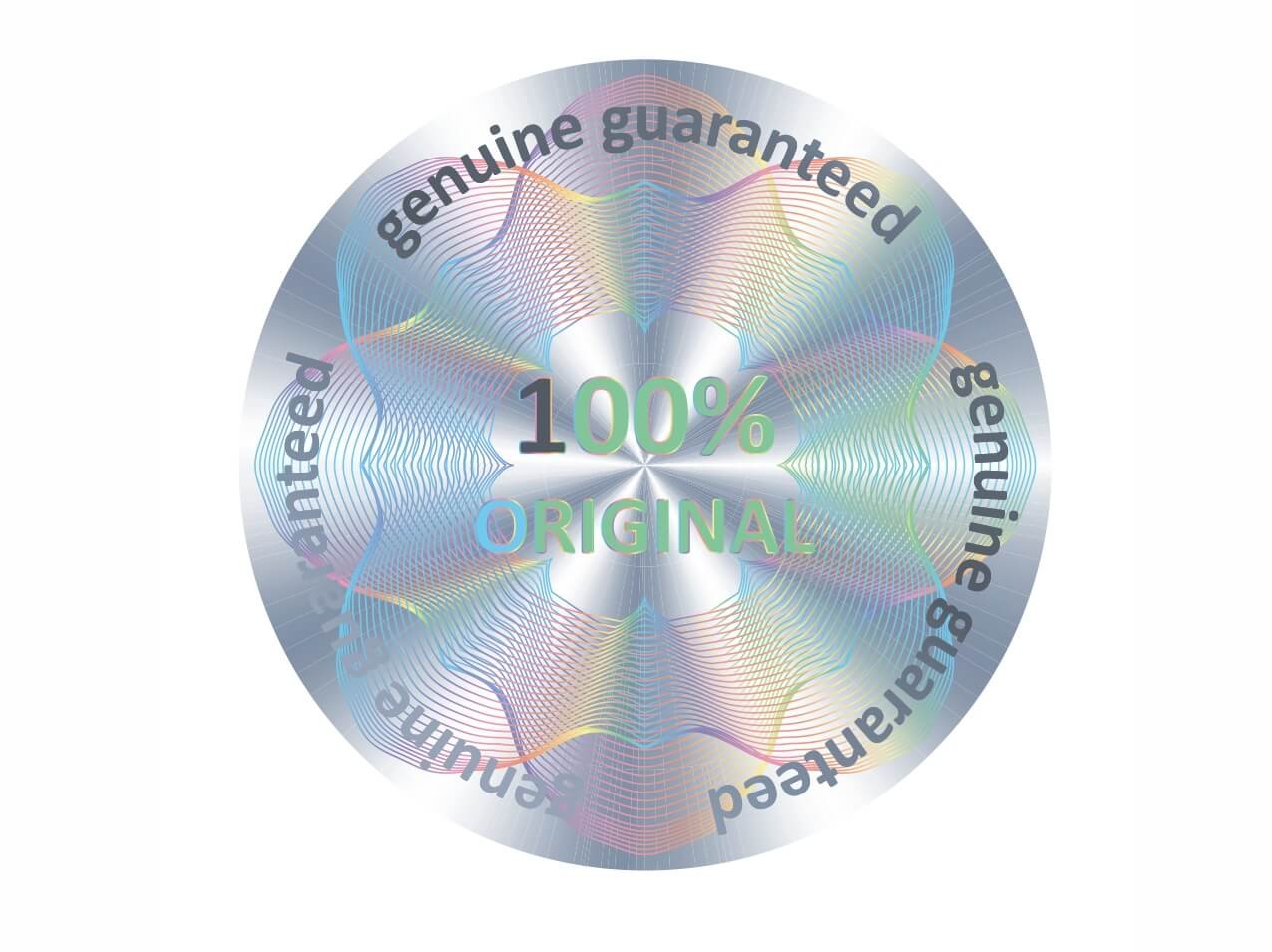 Material: selbstklebende Hologramm Aufkleber 150µ Qualitätsdruck auf silber metallisierter Effektfolie oder 220µ Qualitätsdruck auf silber metallisierter Effektfolie mit Schutzlaminat veredelt